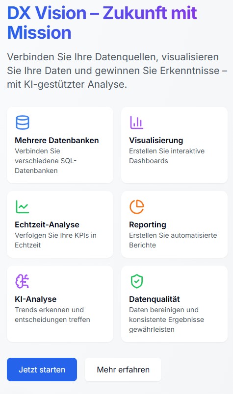 DX Vision ist mehr als nur eine App. Es ist die All-in-One-Plattform, die deine Projekte, Daten, Prozesse und Entscheidungen revolutioniert. Von datengetriebenen Erkenntnissen bis zur smarten Prozessautomatisierung bietet DX Vision alles, was du brauchst, um in einer immer dynamischeren Welt voraus zu sein.